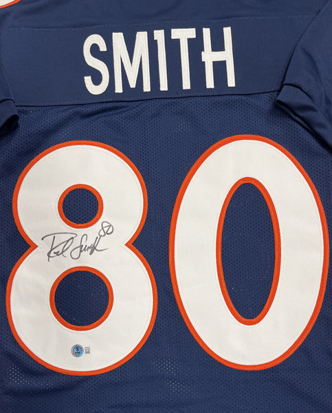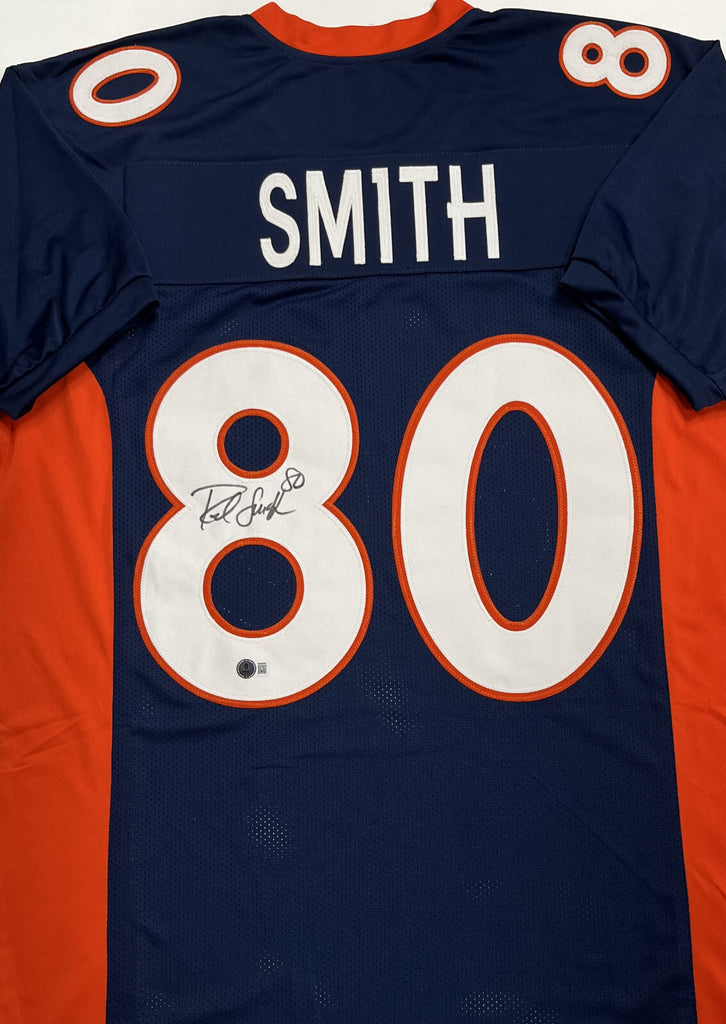 Custom Replica jersey hand signed by Denver Broncos Receiver ROD SMITH. The signature is in Black sharpie. This jersey was signed at a private signing with us and would make a great addition to any BRONCOS collection! The jersey size is XL and all letters and numbers are sewn in.This autograph is guaranteed to be 100% authentic and will include a COA hologram from Beckett Authentication.