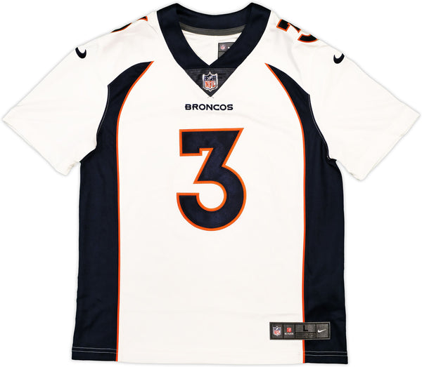 This is a White Nike Denver Broncos Limited Jersey that has been hand signed by Russell Wilson. This jersey is Size L. This item has been certified authentic by Fanatics and comes with their tamper-proof sticker.