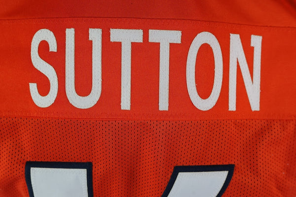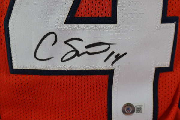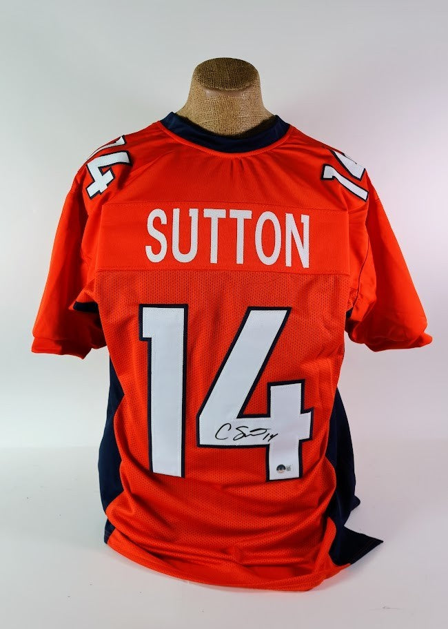 The product is a custom orange Denver Broncos jersey autographed by football player Courtland Sutton. The authenticity of the autograph is guaranteed by Beckett Authentication Services (BAS), making it an original and verified signature. This jersey would be a valuable addition to any sports memorabilia collection, especially for fans of the Denver Broncos or Courtland Sutton.
