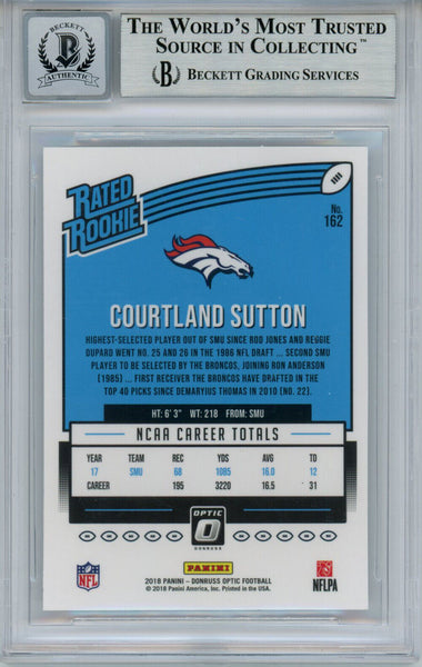 Courtland Sutton Signed 2018 Donruss Optic #162 Rookie Card Beckett 10 Slab 35020 The number in the listing title is just an inventory sku for our records and is not the authentication number. The item pictured is a stock photo unless otherwise noted. This is a 2018 Donruss Optic #162 rookie trading card that was personally autographed by Courtland Sutton. This has been professionally slabbed by Beckett Authentication Services (BAS) and includes a certificate of authenticity from Denver Autographs.