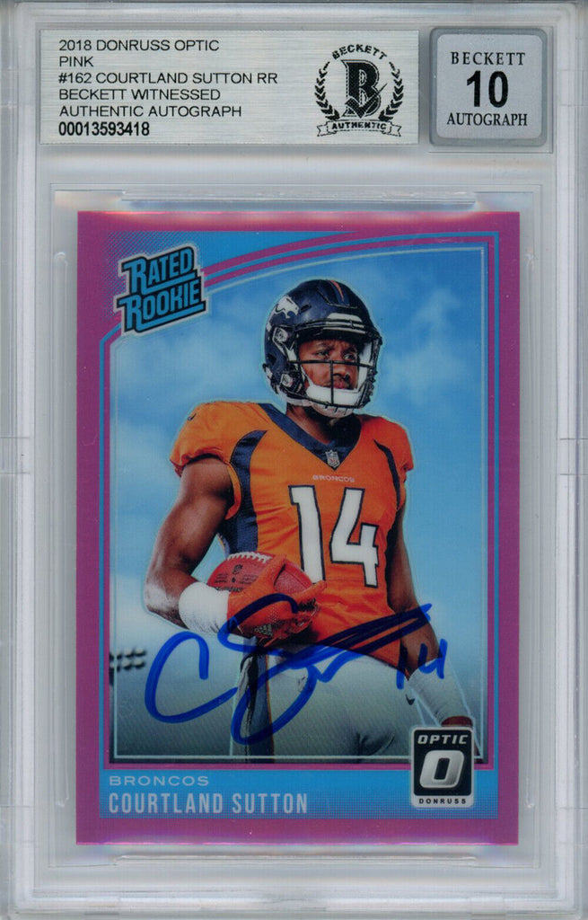 Courtland Sutton Signed 2018 Donruss Optic Pink #162 Rookie Card BAS Slab 35025 The number in the listing title is just an inventory sku for our records and is not the authentication number. The item pictured is a stock photo unless otherwise noted. This is a 2018 Donruss Optic Pink #162 rookie trading card that was personally autographed by Courtland Sutton. This has been professionally slabbed by Beckett Authentication Services (BAS) and includes a certificate of authenticity from Denver Autographs.