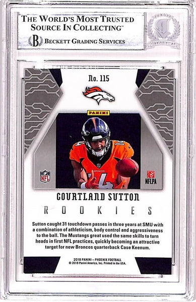 Courtland Sutton Signed 2018 Phoenix #115 Trading Card Beckett 38526 The number in the listing title is just an inventory sku for our records and is not the authentication number. The item pictured is a stock photo unless otherwise noted. This is a slabbed Denver Broncos Phoenix #115 Trading Card that was personally autographed by Courtland Sutton. Includes a certificate of authenticity from Beckett Authentication Services (BAS) and Denver Autographs.