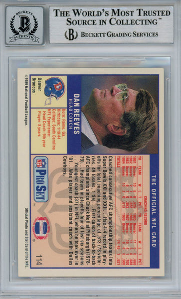 Dan Reeves Autographed 1989 Pro Set #114 Trading Card Beckett 10 Slab 37476 The number in the listing title is just an inventory sku for our records and is not the authentication number. The item pictured is a stock photo unless otherwise noted. This is a trading card that was personally autographed by Dan Reeves. This has been professionally slabbed by Beckett Authentication Services (BAS) and includes a certificate of authenticity from Denver Autographs.