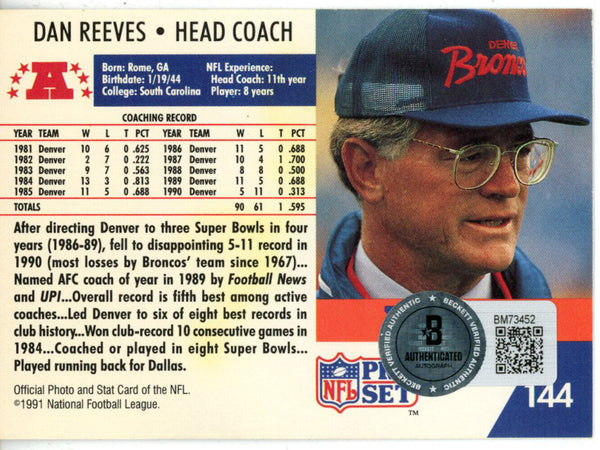 The number in the listing title is just an inventory sku for our records and is not the authentication number. This is the exact item that you will receive so please see pictures for condition. This is a trading card that was personally autographed by Dan Reeves. Includes a certificate of authenticity from Beckett Authentication Services (BAS) and Denver Autographs.FREE SHIPPING within the USA on orders over $10!