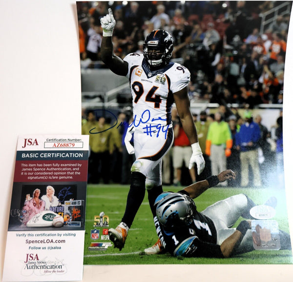 The product is an autographed 8x10 photograph of DeMarcus Ware, authenticated by James Spence Authentication (JSA). It is an original autograph and features Ware in his Denver Broncos attire.