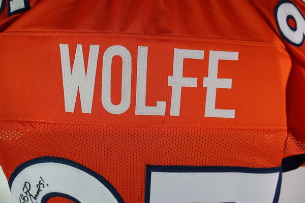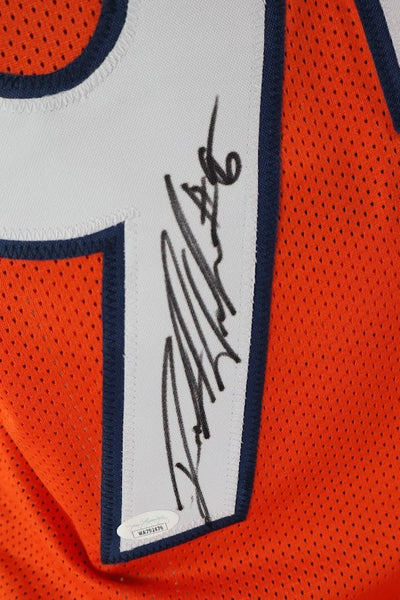 The product is a custom orange Denver Broncos jersey autographed by Derek Wolfe with an inscription, authenticated by James Spence Authentication (JSA). This original autographed jersey is a must-have item for any football fan or collector looking to add a unique and valuable piece to their collection. The signed jersey is a special memorabilia item that showcases the player's authentic signature and connection to the team, making it a prized possession for fans of the Denver Broncos and football enthusiasts alike.