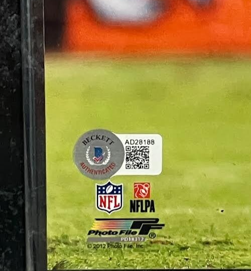 The product is an authentic 8x10 photo of Derek Wolfe, a former player for the Denver Broncos in the NFL, signed by the player himself. The autograph has been authenticated by Beckett Authentication Services (BAS) to ensure its legitimacy. The photo comes with a plaque and a Certificate of Authenticity from Beckett, making it a valuable collectible for fans of the Denver Broncos and football enthusiasts alike.