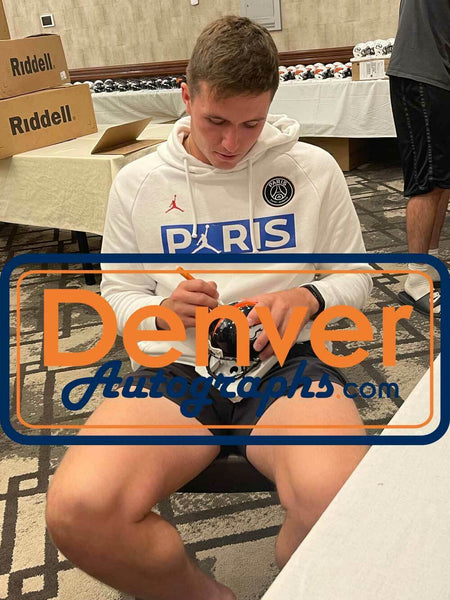 Drew Lock Autographed/Signed Denver Broncos Mini Helmet Beckett BAS 33679 The number in the listing title is just an inventory sku for our records and is not the authentication number. This is a Denver Broncos mini helmet that was personally autographed by Drew Lock. Includes a certificate of authenticity from Beckett Authentication Services (BAS) and Denver Autographs.