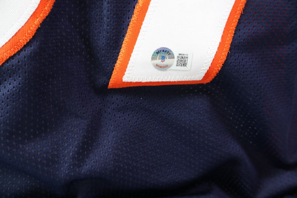 The product is an autographed Denver Broncos navy jersey signed by Ed McCaffrey, a former football player. The jersey has been authenticated by Beckett Authentication Services (BAS), ensuring the signature's authenticity. It is an original piece and is signed by the player. This item would be a highly sought-after collectible for fans of the Denver Broncos or Ed McCaffrey.