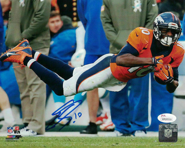 Emmanuel Sanders Autographed/Signed Denver Broncos 8x10 Photo JSA 14524 PF This is an officially licensed 8x10 photo that was personally autographed by wide receiver Emmanuel Sanders.This photo includes a certificate of authenticity from James Spence Authentication (JSA) and Denver Autographs.