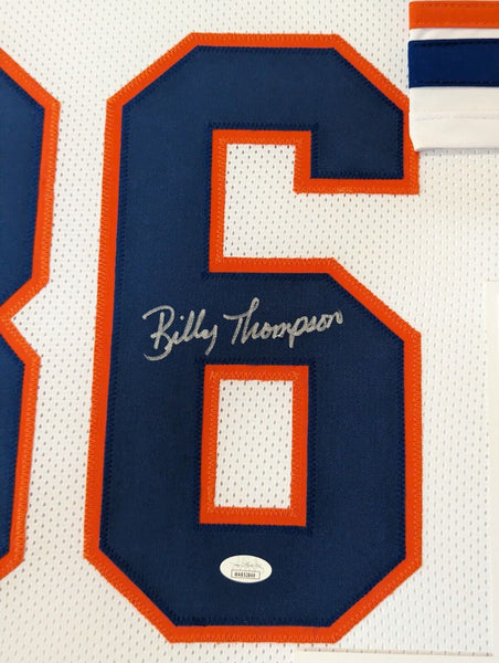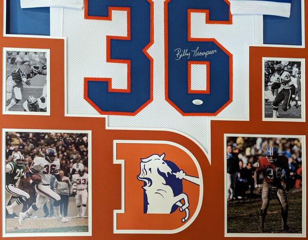 Framed Billy Thompson signed Denver Broncos style Custom Jersey. JSA COA The authentication is from JSA. This signature is authenticated by a representative of JSA! 100% AUTHENTIC!!! The jersey has fully stitched numbers on the front and back. No tags or logos. This is not an official NFL jersey but it is very high quality. It is a great item and a must for all great sports fans! This item is professionally framed, it measures 32"x40" inside , 42"x34" outside , using UV protective Acrylic glass for safe keeping and safe transport, team color matting, black moulding and hanging hooks on the back. All additional items in frame seen in pictures included. 100% ready to hang in your fan cave.