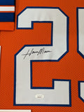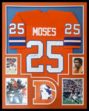 Framed Haven Moses signed Denver Broncos style Custom Jersey. JSA COA The authentication is from JSA. This signature is authenticated by a representative of JSA! 100% AUTHENTIC!!! The jersey has fully stitched numbers on the front and back. No tags or logos. This is not an official NFL jersey but it is very high quality. It is a great item and a must for all great sports fans! This item is professionally framed, it measures 32"x40" inside , 42"x34" outside , using UV protective Acrylic glass for safe keeping and safe transport, team color matting, black moulding and hanging hooks on the back. All additional items in frame seen in pictures included. 100% ready to hang in your fan cave.