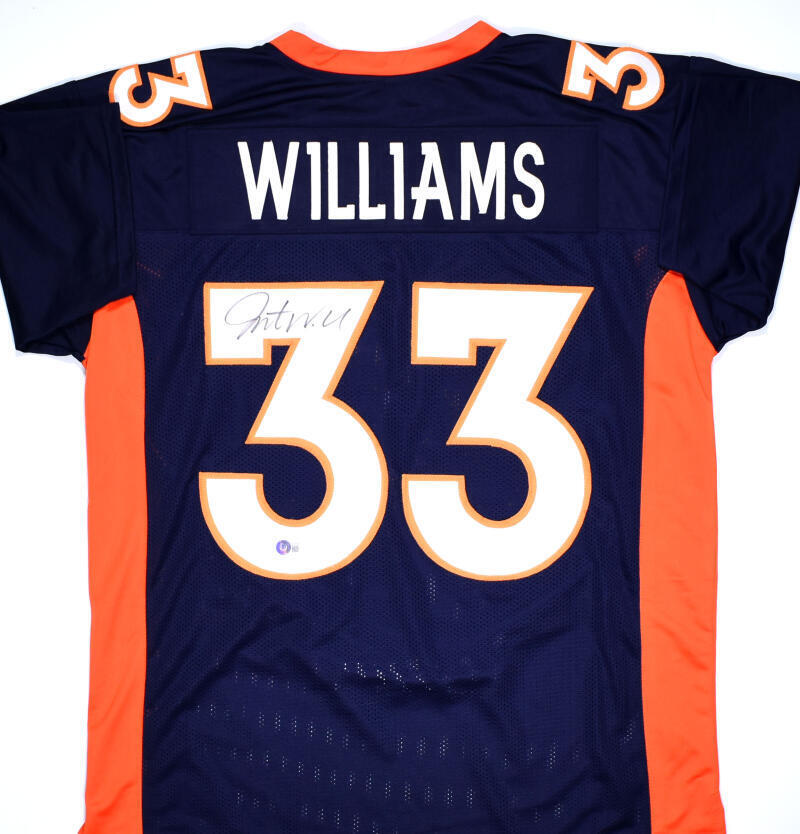 Javonte Williams Autographed Blue Pro Style Jersey- Beckett W Hologram *Black THIS IS NOT AN NFL JERSEY. THIS HAS NO TAGS, NO LOGOS, NO EMBLEMS. This is a hand autograph of Javonte Williams on a custom (Non Name Brand) Authentic style Jersey with stitched letters and numbers. This item has a Beckett Witnessed Authentication, which comes with a Beckett numbered hologram and a QR code for verification. You can view this item on the Beckett Authentication website and it shows when and where the item was signed. It was signed either at a public autograph appearance or a private signing. This is a stock photo of the item. Although you may not receive this exact item, the item you receive is virtually identical and brand new in great shape. Jersey size is XL.