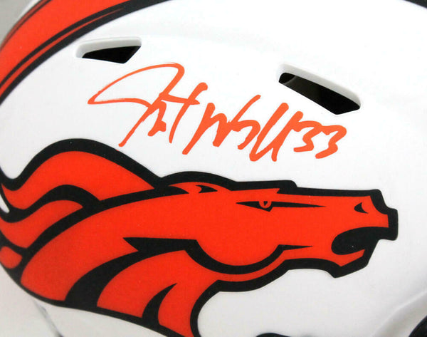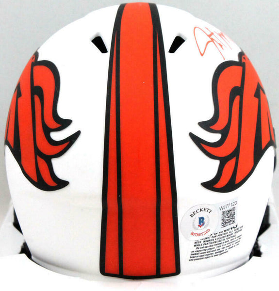 Javonte Williams Autographed Denver Broncos Lunar Speed Mini Helmet-Beckett W Hologram This is a Javonte Williams of the Denver Broncos hand autographed Riddell Football Lunar Speed Mini Helmet. This item has a Beckett Witnessed Authentication, which comes with a numbered sticker hologram and a generic Beckett Certificate of Authenticity. You can view this item on the Beckett Authentication website. It was signed either at a public autograph appearance or a private signing. This is a stock photo of the item. Although you may not receive this exact item, the item you receive is virtually identical, brand new, and in great shape.