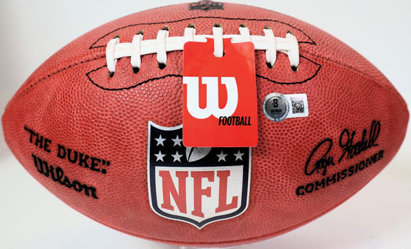 The product is an authentic John Elway autographed Denver Broncos "The Duke" NFL game ball, complete with a personal inscription. This collectible item is officially licensed and authenticated by Beckett Authentication Services (BAS), ensuring the signature's authenticity. Fans of football and the Denver Broncos will appreciate this unique piece of memorabilia from one of the team's legendary players. This autographed ball would make a valuable addition to any sports memorabilia collection.