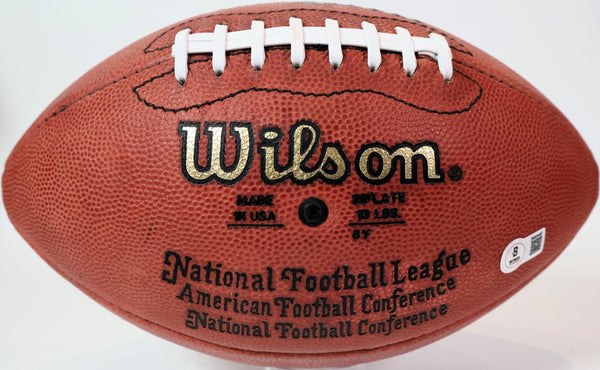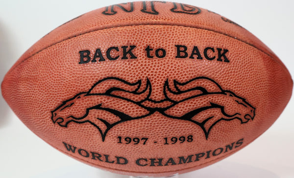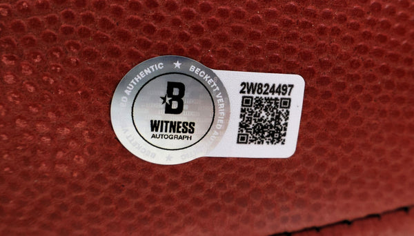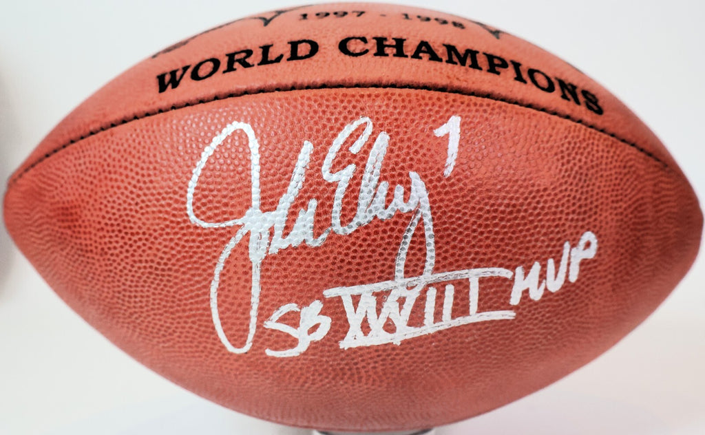 The product is a John Elway autographed Denver Broncos NFL game ball with an inscription. This authentic piece is verified with a Beckett Certificate of Authenticity (COA), ensuring the signature's legitimacy. As a collectible item for football fans, this unique memento showcases the legendary player's autograph and association with the Denver Broncos, making it a valuable addition to any sports memorabilia collection.