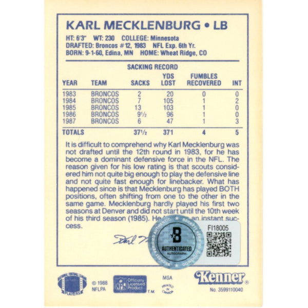 The number in the listing title is just an inventory sku for our records and is not the authentication number. The item pictured is the exact item you will receive, please see photos for condition. This is a Denver Broncos 1988 Starting Lineup Trading Card that was personally autographed by Karl Mecklenburg. Includes a certificate of authenticity from Beckett Authentication Services (BAS) and Denver Autographs. FREE SHIPPING within the USA on orders over $99!