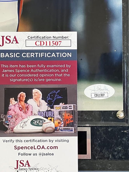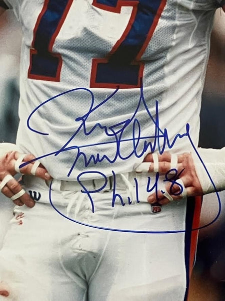 The product is an authentic 8x10 photo of Karl Mecklenburg, a former player for the Denver Broncos in football. The photo is signed by Mecklenburg himself, inscribed with biblical verse Phil:4:8, and comes with a plaque. The autograph is authenticated by James Spence Authentication (JSA), ensuring its authenticity. This collectible item would be a great addition to any sports memorabilia collection, especially for fans of the Denver Broncos or football in general.