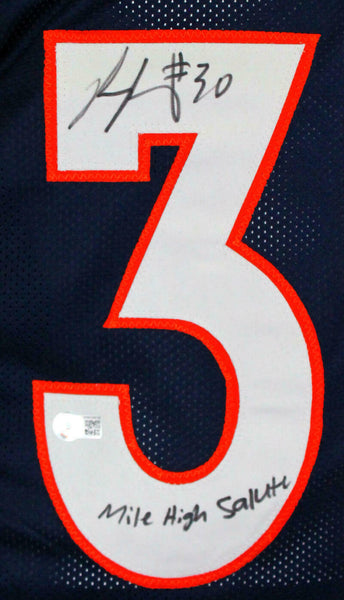 Phillip Lindsay Autographed Blue Pro Style Jersey w/Insc.-Beckett W Hologram THIS IS NOT AN NFL JERSEY. THIS HAS NO TAGS, NO LOGOS, NO EMBLEMS. This is a Hand Autograph of Phillip Lindsay on a custom made (Non Name Brand) authentic style jersey with stitched letters and numbers. Inscribed Mile High Salute. This item has a Beckett Witnessed Authentication, which comes with a Beckett numbered hologram and a generic Beckett certificate of authenticity. You can view this item on the Beckett website and it shows when and where the item was signed. It was signed either at a public autograph appearance or a private signing. This is a stock photo of the item. Although you may not receive this exact item, the item you receive is virtually identical and brand new in great shape. Jersey Size is XL.