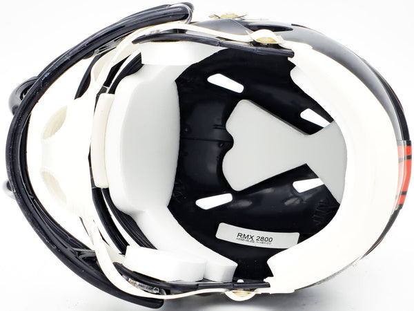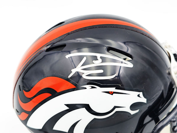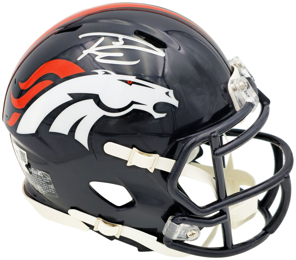 This is a Denver Broncos Blue Speed Mini Helmet that has been hand signed by Russell Wilson. This item has been certified authentic by Fanatics and comes with their tamper-proof sticker.
