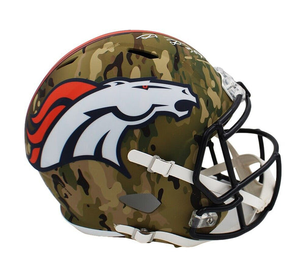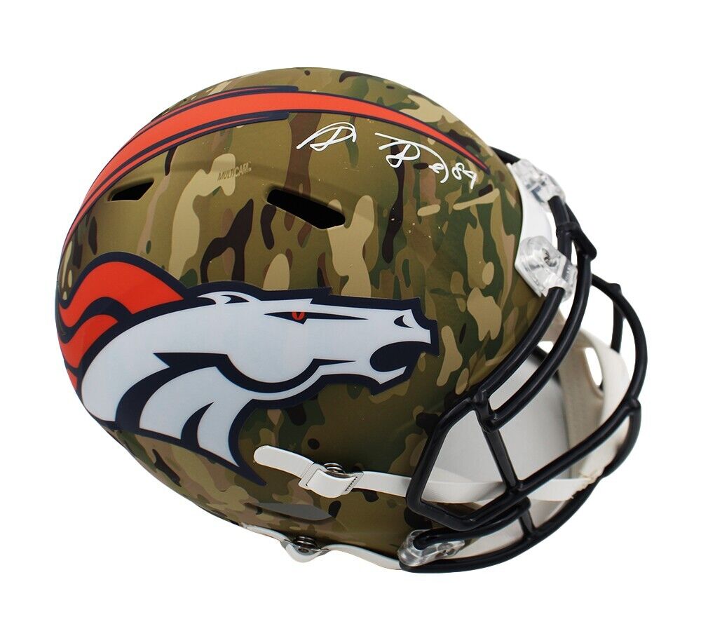 A Denver Broncos Speed Replica Camo NFL Helmet hand signed by Shannon Sharpe. The item and signatures are in excellent condition. Sharpe is a 3x Super Bowl Champion, 8x Pro Bowler, 4x First-team All-Pro, & Second -team All-Pro. AUTHENTICATION: The item has been tagged with a SmarTag powered by Prova Technology, which gives you digital access to the items authentication records, including a proof picture from the signing.