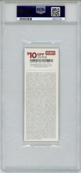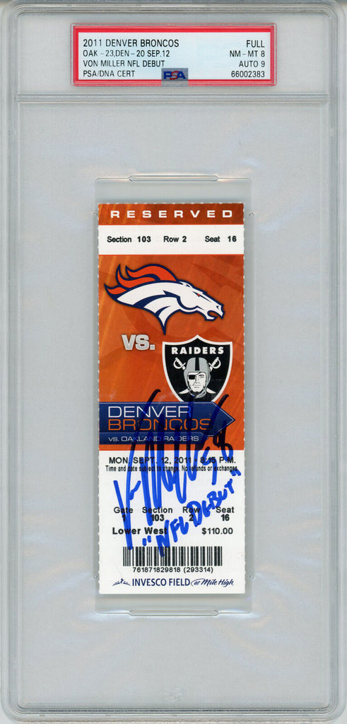 Von Miller Signed 9/12/2011 Ticket w/NFL Debut Grade 8 PSA 9 Slab 34355 The number in the listing title is just an inventory sku for our records and is not the authentication number. This is the exact item that you will receive so please see pictures for condition. This is a ticket that was personally autographed by Von Miller with NFL Debut inscription. This has been professionally slabbed by Professional Authentication Services (PSA) and includes a certificate of authenticity from Denver Autographs.