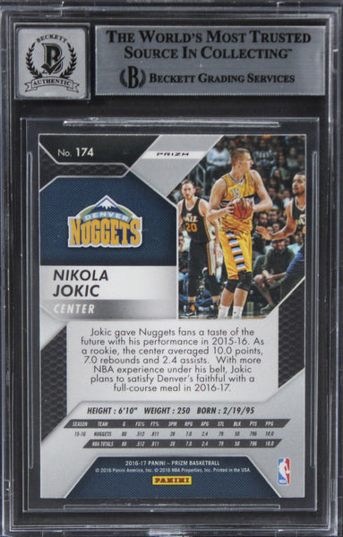 This Autographed Auto Graded Gem Mint 10! 2016 Panini Prizm Prizms Silver #174 Card has been Personally Signed by Nikola Jokic of the Denver Nuggets. This item is 100% Authentic, it comes slabbed and authenticated by Beckett Authentication Services. The authenticity can be verified on Beckett Authentication Services website.