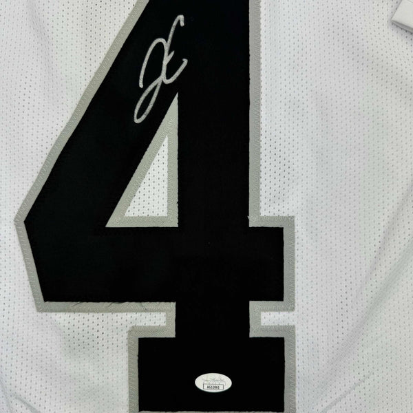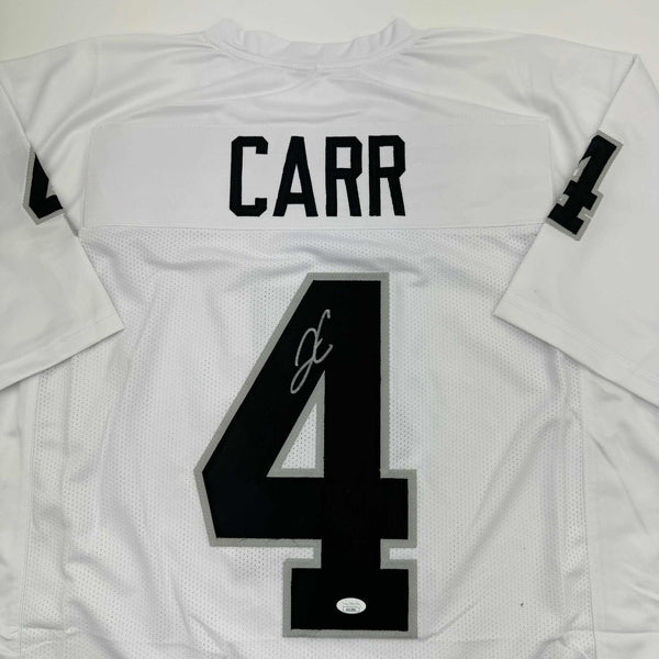 Autographed/Signed Derek Carr Las Vegas Oakland White Football Jersey JSA COA Jersey has no brand names or logos. This is a custom jersey and was not manufactured by or in any manner associated with any professional sports league or manufacturer. This custom jersey carries no professional sports league designation. The item is intended to be an autographed collectible. The custom jersey displays the name and number of the player. This item in no way is affiliated with or connected to any professional sports organization. Size is XL