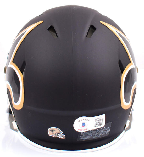Derek Carr Autographed New Orleans Saints Amp Speed Mini Helmet-Beckett W Hologram *Gold This is a Hand Autograph of Derek Carr of the New Orleans Saints on a Riddell Football Eclipse Speed Mini Helmet. It has a Beckett Witness Authentication, which comes with a Beckett numbered sticker hologram and a QR code for verification. You can view this item on the Beckett website and it shows when and where the item was signed. It was signed either at a public autograph appearance or a private signing. This is a stock photo of the item. Although you may not receive this exact item, the item you receive is virtually identical and brand new in great shape.