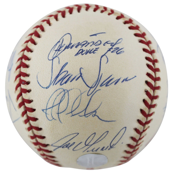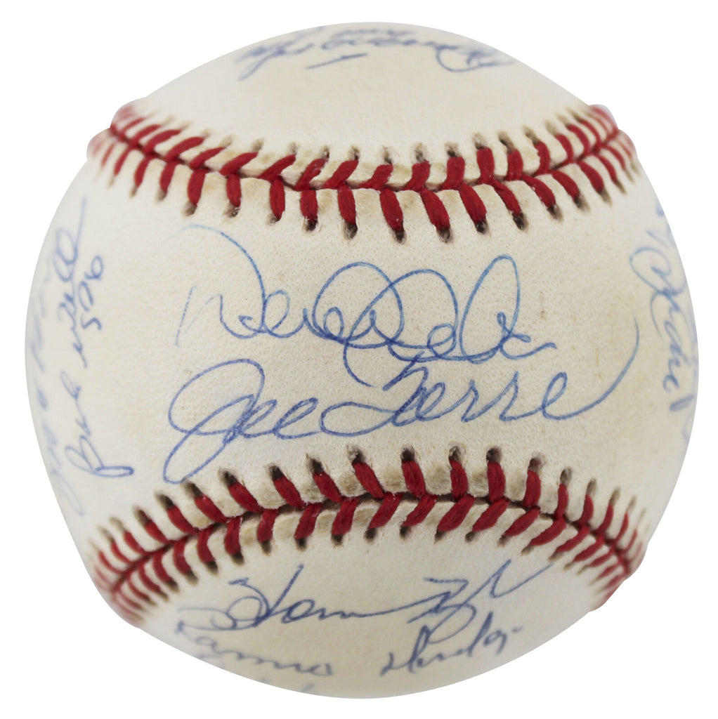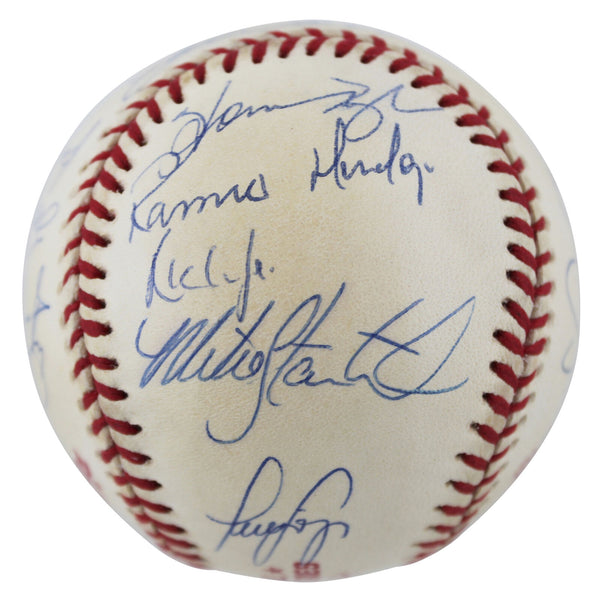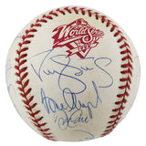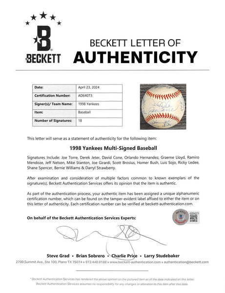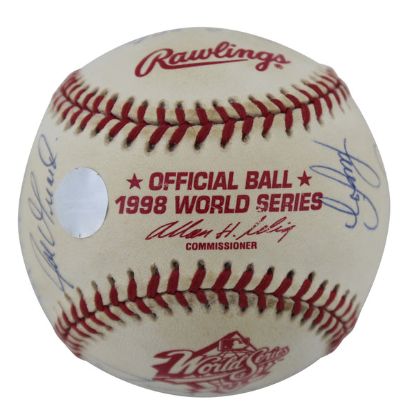 This Autographed 1998 World Series Logo Oml Baseball has been Personally Signed by Derek Jeter, Joe Torre, David Cone, Orlando Hernandez, Graeme Lloyd, Ramiro Mendoze, Jeff Nelson, Mike Stanton, Joe Girardi, Scott Brosius, Homer Bush, Luis Sojo, Ricky Ledee, Shane Spencer, Bernie Williams & Darryl Strawberry of the New York Yankees. This item is 100% Authentic to include a Certificate of Authenticity (COA) / hologram by Beckett Authentication Services. The authenticity can be verified on Beckett Authentication Services website.