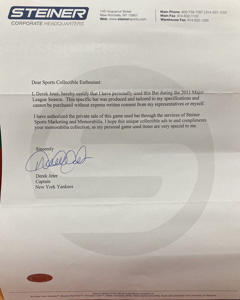 Featured is a Derek Jeter signed 2011 New York Yankees game used Louisville Slugger baseball bat. This bat has been hand signed by Jeter and comes with the Steiner Sports hologram, along with the Jeter letter of authenticity. This bat would make a great addition to any sports memorabilia collection! SPECIFICATIONS Autographed By: Derek Jeter Team: New York Yankees Sport: Baseball Authentication: Steiner Sports
