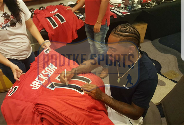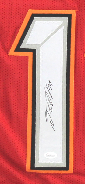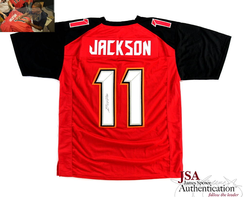 A Tampa Bay Red Custom Jersey hand signed by DeSean Jackson. The item and signature are in excellent condition.. AUTHENTICATION: The item is accompanied by JSA Certificate of Authenticity - JSA Serial Numbered & Databased Hologram Hologram - Picture of DeSean from the Signing -