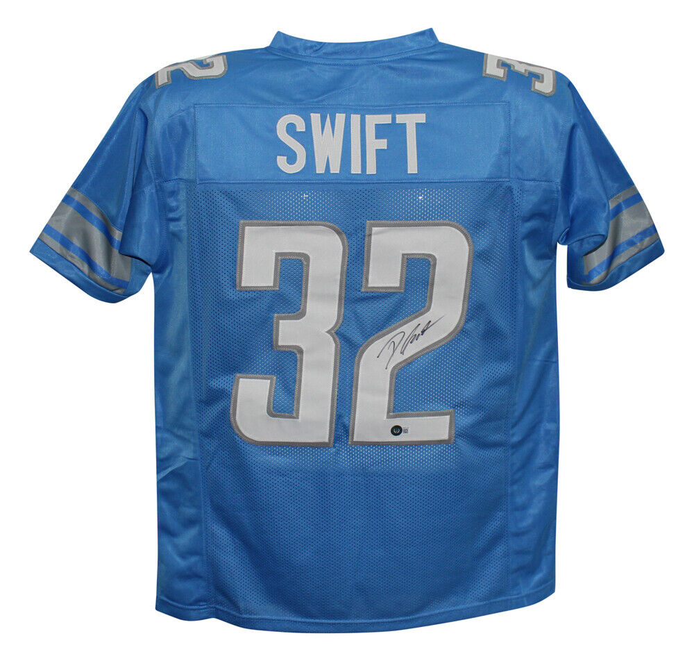 D'Andre Swift Autographed/Signed Pro Style Blue XL Jersey Beckett 38670 The number in the listing title is just an inventory sku for our records and is not the authentication number. The item pictured is a stock photo unless otherwise noted. This is a custom pro style blue XL jersey with sewn on anem and numbers that was personally autographed by D'Andre Swift. Includes a certificate of authenticity from Beckett Authentication Services (BAS) and Denver Autographs.