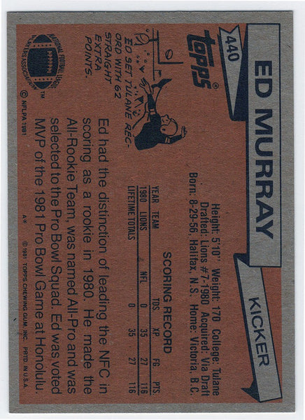 Eddie Murray signed Detroit Lions 1981 Topps rookie football trading card #440. Item comes with a Schwartz Sports Memorabilia tamper-proof numbered hologram (on back of physical card) and Certificate of Authenticity which can be verified online.