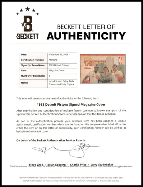 This is an 11x14 NBA Today Magazine Page Photo that has been hand signed by Chuck Daly, Isiah Thomas & Kelly Tripucka. This item has been certified authentic by Beckett Authentication (BAS) and comes with their tamper-proof hologram and matching full-page certificate of authenticity.