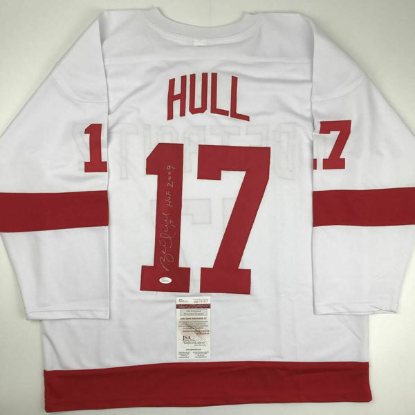 Autographed/Signed BRETT HULL HOF 2009 Detroit White Hockey Jersey JSA COA Auto This is a custom jersey and was not manufactured by or in any manner associated with any professional sports league or manufacturer. This custom jersey carries no professional sports league designation. The item is intended to be an autographed collectible. Reference of team in the title is to allow the purchaser a point of association. The custom jersey displays the name, number and authenticated signature of the player. This item in no way is affiliated with or connected to any professional sports organization. The autograph, as always is guaranteed to be authentic and has been certified as authentic by a third-party, trusted authenticator. Size is XL unless otherwise noted.
