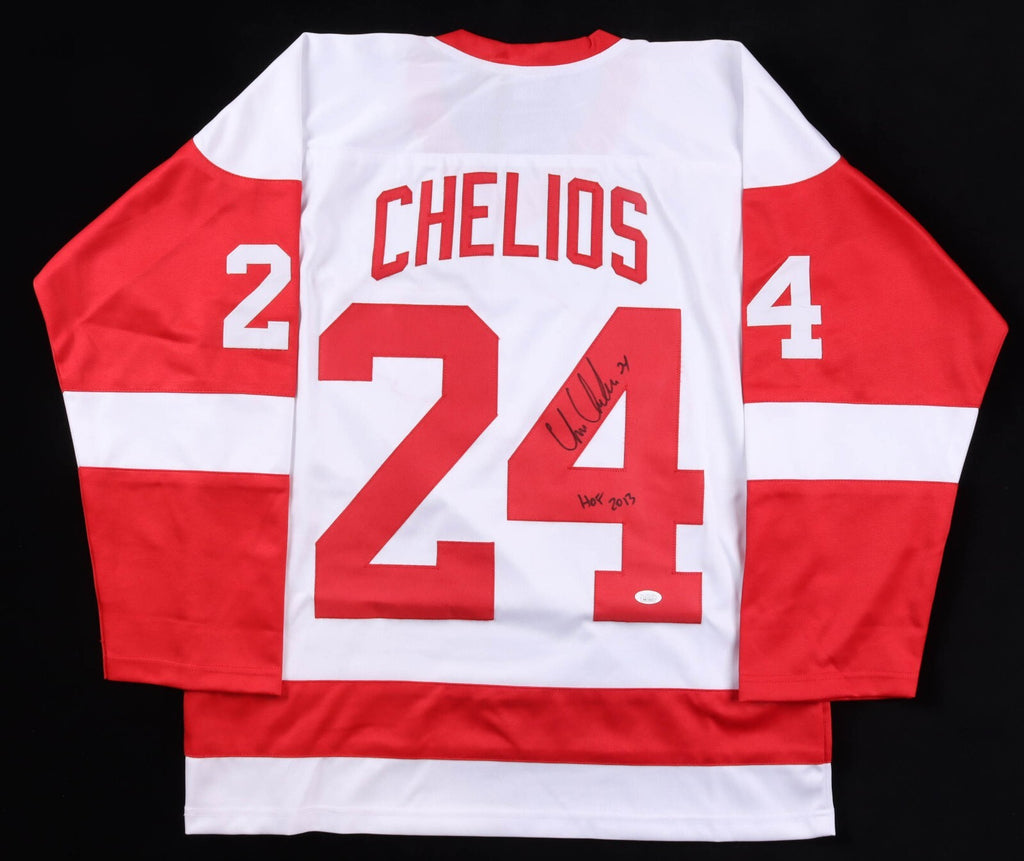 Custom on-ice style jersey. Everything sewn on, size XL. Hand-signed and inscribed in silver felt-tip pen by Chris Chelios (HOF).The autograph includes an official James Spence Authentication (JSA) hologram and matching COA for authenticity purposes. The signing of this item was witnessed by JSA.Authentication: JSA COA