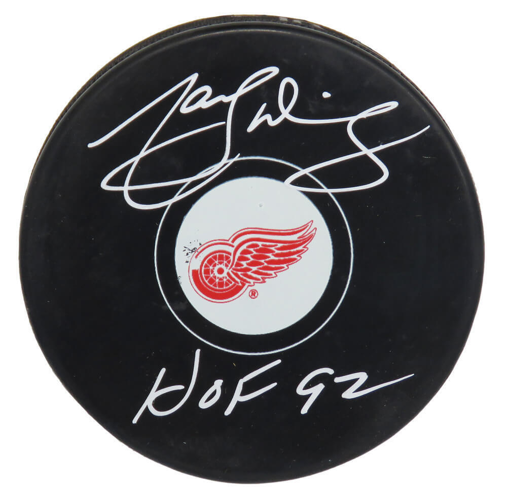 Marcel Dionne signed Detroit Red Wings logo hockey puck with 'HOF 92' inscription. Item comes with a Schwartz Sports Memorabilia tamper-proof numbered hologram and Certificate of Authenticity which can be verified online.