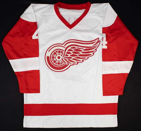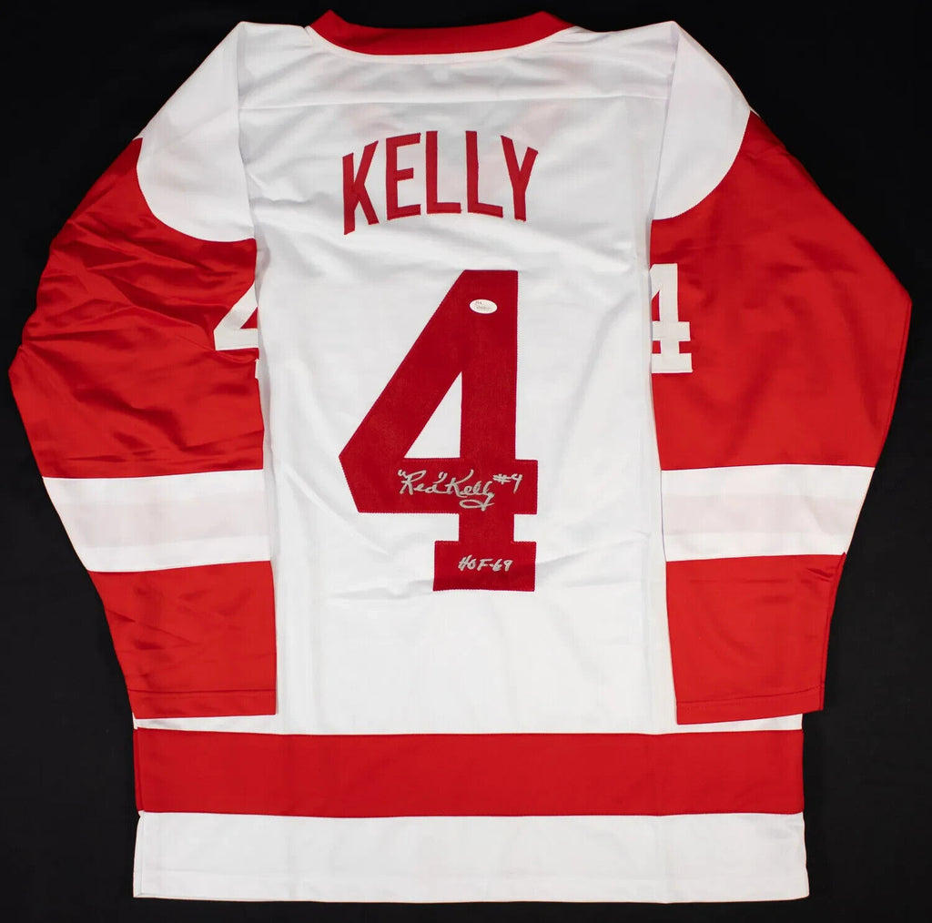 This autographed custom on-ice style adult XL jersey has been personally hand-signed by Red Kelly of the Detroit Red Wings. When signing, Kelly inscribed "HOF 69" along with his signature. Mr. Kelly passed away in 2019 at the age of 91.This autograph is certified by James Spence Authentication's (JSA) Witnessed Protection Program. That means that a JSA representative was present when this item was signed. It comes with the numbered hologram and matching Certificate of Authenticity.Custom on-ice style jerseys are a more affordable option for autograph seekers. These jerseys do not have any brand name or tags and are made in the Philippines. They feature stitched on names and numbers and are made to look very similar to the on-field jerseys that the players wear. These custom jerseys are very commonly used in the memorabilia industry.