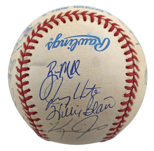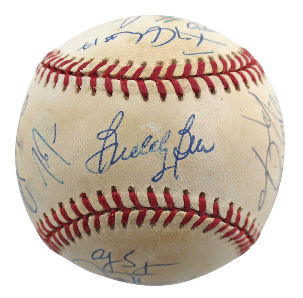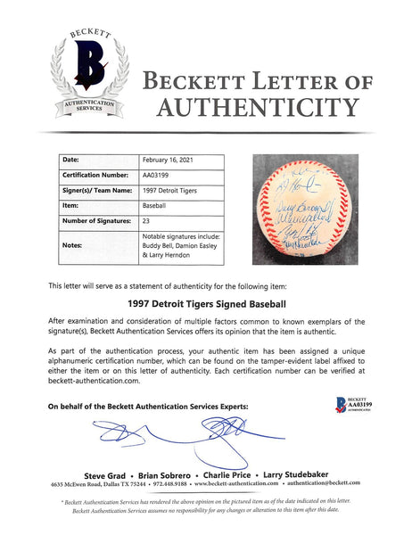 This Autographed Gene Budig Oal Baseball has been Personally Signed by Larry Herndon, Buddy Bell, Doug Brocail, Kevin Jarvis, Greg Keagle, Brian Moehler, Mike Myers, Tim Pugh, A.J. Sager, Matt Walbeck, Frank Catalanotto, Tony Clark, Deivi Cruz, Damion Easley & 9 more of the Detroit Tigers. This item is 100% Authentic to include a Certificate of Authenticity (COA) / hologram by Beckett Authentication Services. The authenticity can be verified on Beckett Authentication Services website.