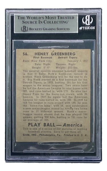 Featured is a Hank Greenberg signed 1939 Play Ball #56 Detroit Tigers trading card. This card has been hand signed by Greenberg and has been authenticated and encapsulated by Beckett. This card would make a great addition to any sports memorabilia collection! SPECIFICATIONS Autographed By: Hank Greenberg Team: Detroit Tigers Sport: Baseball Authentication: Beckett Grading Services