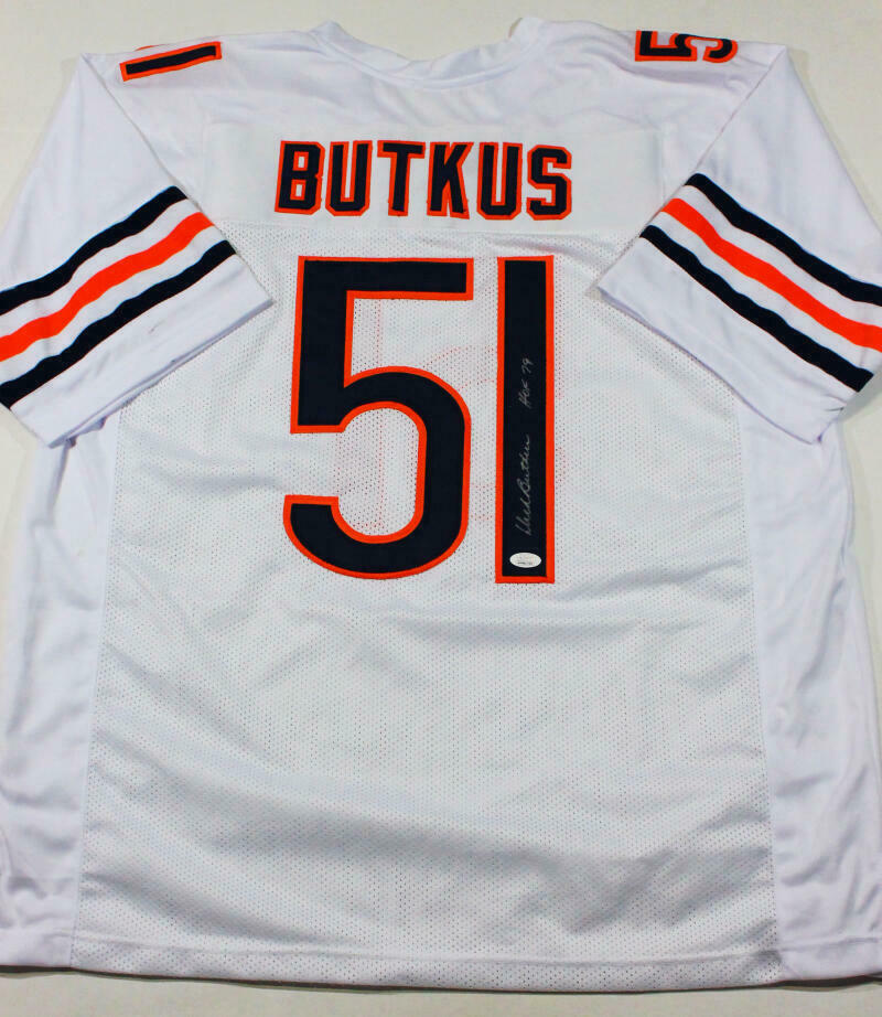 Dick Butkus Autographed White Pro Style Jersey w/ HOF - JSA W Auth *1 THIS IS NOT AN NFL JERSEY. THIS HAS NO TAGS, NO LOGOS, NO EMBLEMS. This is a hand autographed Jersey of Dick Butkus. This is Custom Made (non name brand) Authentic Style (stitched letters and numbers). This item is inscribed with HOF 79. This item has a James Spence Witness Protection Authentication, which comes with a numbered sticker and a matching JSA Certificate of Authenticity. You can view this item on the SpenceLOA website and it shows when and where the item was signed. It was signed either at a public autograph appearance or a private signing. This is a stock photo of the item. Although you may not receive this exact item, the item you receive is virtually identical and brand new in great shape. Jersey size is XL.