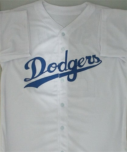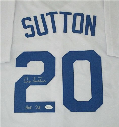 Custom replica stitched jersey of Los Angeles Dodgers Hall of Famer DON SUTTON (Deceased). This jersey is signed with Silver Paint Pen and includes the inscription "HOF '98". This jersey is size XL with all letters and numbers sewn in. This item was signed at a signing in our store in 2017 and would make a great addition to any Dodgers collection. This autograph is guaranteed to be 100% authentic and will include a COA from JSA (James Spence Authentication.