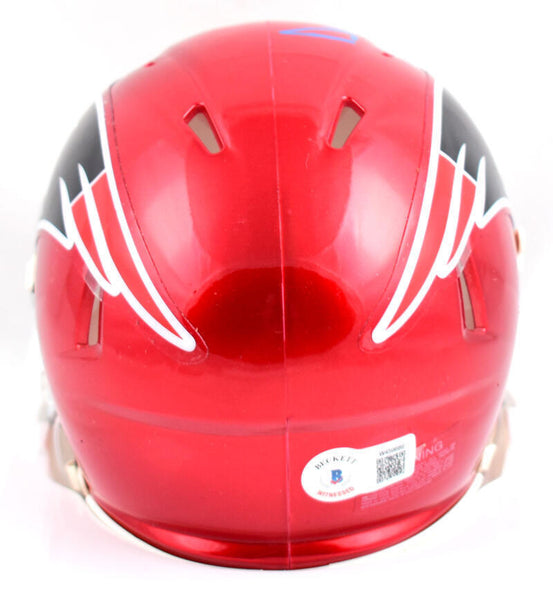 Drew Bledsoe Autographed New England Patriots Flash Speed Mini Helmet-Beckett W Hologram *Blue This is a hand autograph of Drew Bledsoe of the New England Patriots on a Riddell Football Flash Speed Mini Helmet. It has a Beckett Witness Authentication, which comes with a numbered hologram and QR code for verification. You can view this item on the Beckett Authentication website and it shows when and where the item was signed. It was signed either at a public autograph appearance or a private signing. This is a stock photo of the item. Although you may not receive this exact item, the item you receive is virtually identical and brand new in great shape.