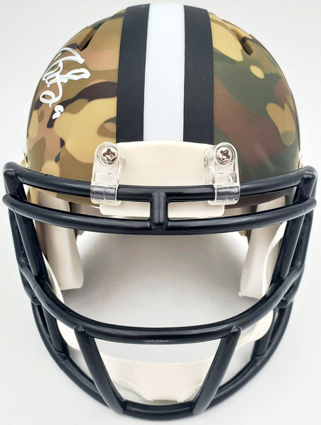 This is a New Orleans Saints Speed Camo Mini Helmet that has been hand signed by Drew Brees. This item has been certified authentic by Beckett Authentication (BAS) and comes with their serial numbered sticker and matching certificate of authenticity. A NOTE: Because each Camo helmet is hand-dipped using water-transfer technology there may be slight imperfections.