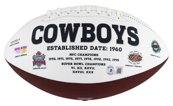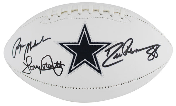 This Autographed Rawlings White Panel Logo Football with the inscription of "HOF 21 (Pearson), HOF 85 (Staubach), HOF 94 (Dorsett)" has been Personally Signed by Roger Staubach, Tony Dorsett & Drew Pearson of the Dallas Cowboys. This item is 100% Authentic to include a hologram by Beckett Authentication Services. This item will come with the new Beckett Authentication hologram that has a scannable QR code rather than the traditional COA. If you would like to have a COA, you are welcome to reach out to Beckett for a printed certification once you receive your item. This is a BAS Witnessed Protection Program item which means a Beckett Authentication Service representative was present when this item was being signed. We conducted an autograph signing with Roger Staubach, Tony Dorsett & Drew Pearson where multiples of the same item were signed. While the photographs are representative of this item, the size, placement and strength of the signature may vary. Each item is hand signed, therefore, each autograph is unique. This item can be verified through BAS Witnessed.