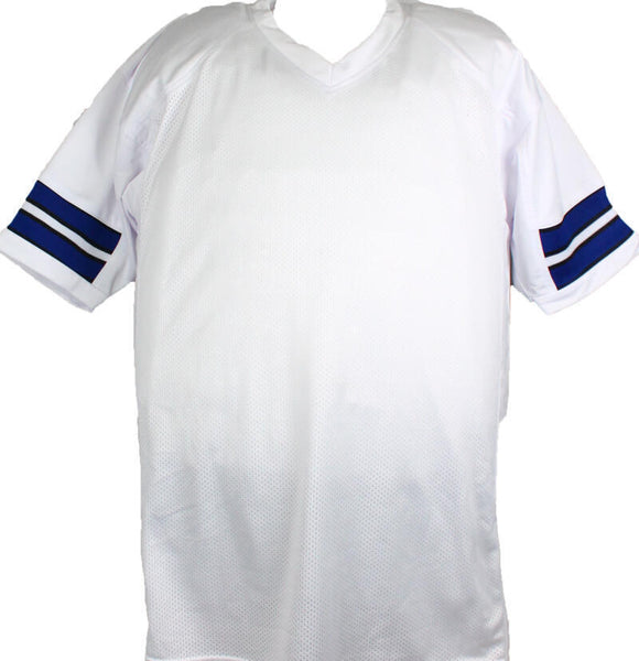 Roger Staubach Drew Pearson Tony Dorsett Autographed White Pro Style Jersey-Beckett W Hologram *Silver THIS IS NOT AN NFL JERSEY. THIS HAS NO TAGS, NO LOGOS, NO EMBLEMS. This is a hand autographed Jersey of Roger Staubach, Drew Pearson and Tony Dorsett. This is a Custom Made (non name brand) Authentic Style (stitched letters and numbers). This item has a Beckett Witnessed Authentication, which comes with a numbered sticker hologram and a QR code for verification. You can view this item on the Beckett Authentication website, it shows when and where the item was signed. It was signed either at a public autograph appearance or a private signing. This is a stock photo of the item. Although you may not receive this exact item, the item you receive is virtually identical and brand new in great shape. Jersey size is XL.