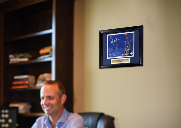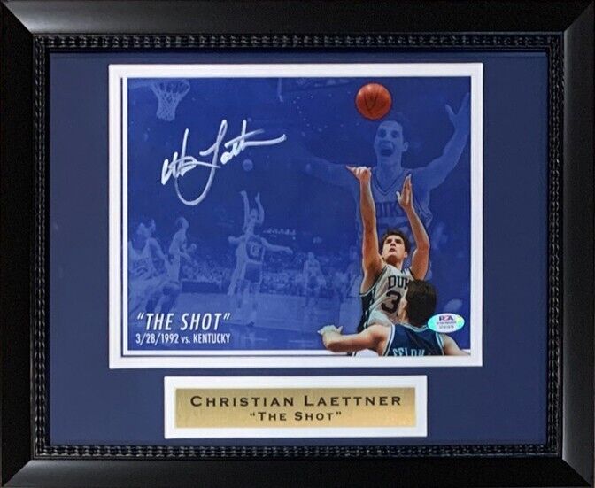 Christian Laettner who made one of the most famous shots in college basketball history has autographed this 8x10 photo of that play which put Duke past Kentucky and into the National Championship game that year which they would ultimately win. Autograph is authenticated and witnessed by PSA/DNA the world's leading authenticator of sports autographs. Comes with their unique sticker # fixed to the item and verified on their website. Also comes with their certificate of authenticity with same matching #. Photo comes framed as shown and ready to hag. Frame measures 13x16.
