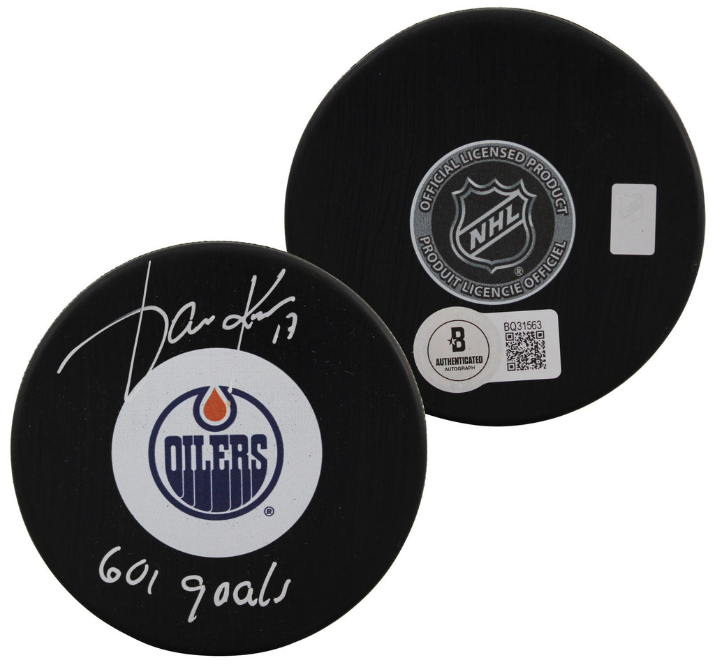 This Autographed Official NHL Hockey Puck with the inscription of "601 Goals" has been Personally Signed by Jari Kurri of the Edmonton Oilers. This item is 100% Authentic to include a hologram by Beckett Authentication Services. This item will come with an affixed Beckett Authentication Services (BAS) authentication sticker, which includes a scannable QR code to verify authenticity. Please note that Beckett no longer provides serial-numbered COA cards, and the attached BAS sticker will serve as the complete authentication for this item. The authenticity can be verified on Beckett Authentication Services website.