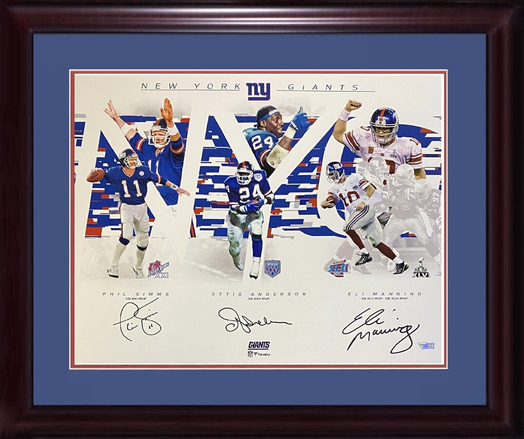 Giants super Bowl MVP's Eli Manning, Phil Simms and Ottis Anderson hand signed 16x20 Collage photograph custom framed beautifully and ready to hang, The final framed dimensions are approximately 22x26. This is Fanatics certified with their hologram only and also comes with a Certificate of authenticity! The listings above also shows the certification on Fanatics' website with the matching serial number .